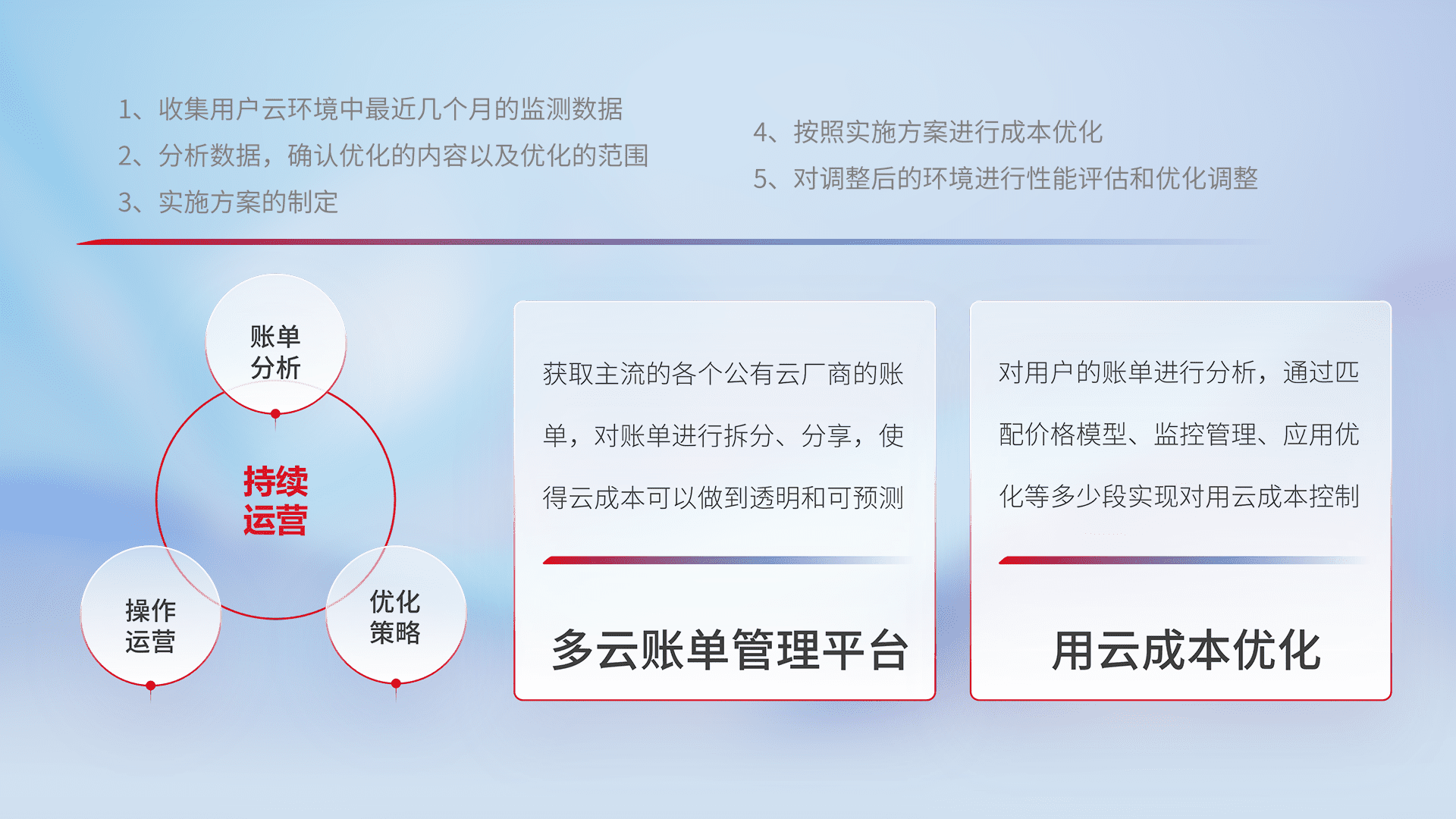 通过多云纳管,,,以统一的资源数据模型把客户的云资源进行抽象和封装,,进而实现对多云资源的统一操作,,,,保障云资源管理的可靠性、、稳定性与可用性。。。。量身定制化运维内容,,,配置、、、开发运维、、补丁管理、、、、备份、、、、监控、、认证和访问管理、、审计和日常巡检等,,保障在用云过程中的可靠度,,稳定度以及高可用率。。。。